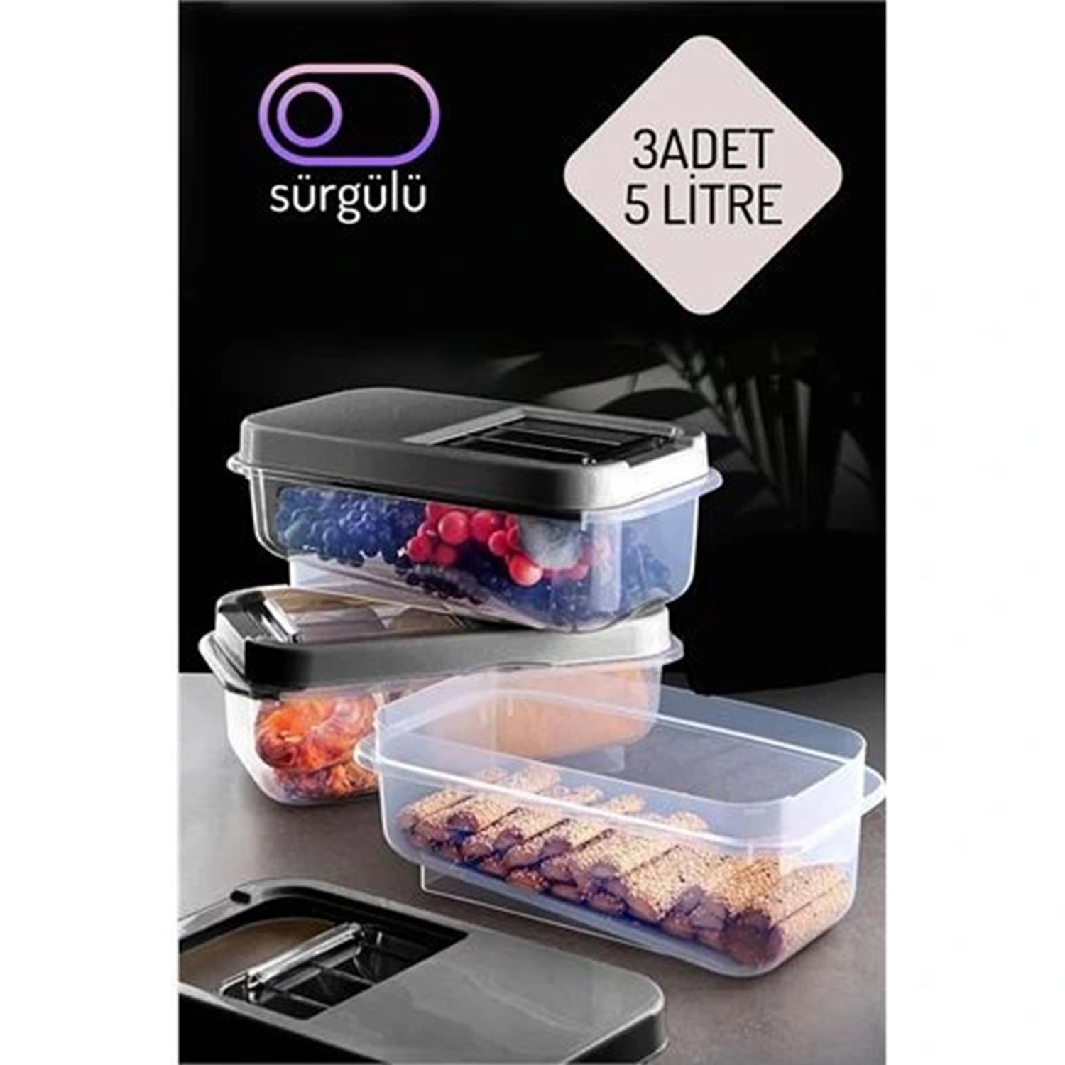Erzak Bakliyat Saklama Kabı 3 lü Set 5 Lt Antrasit